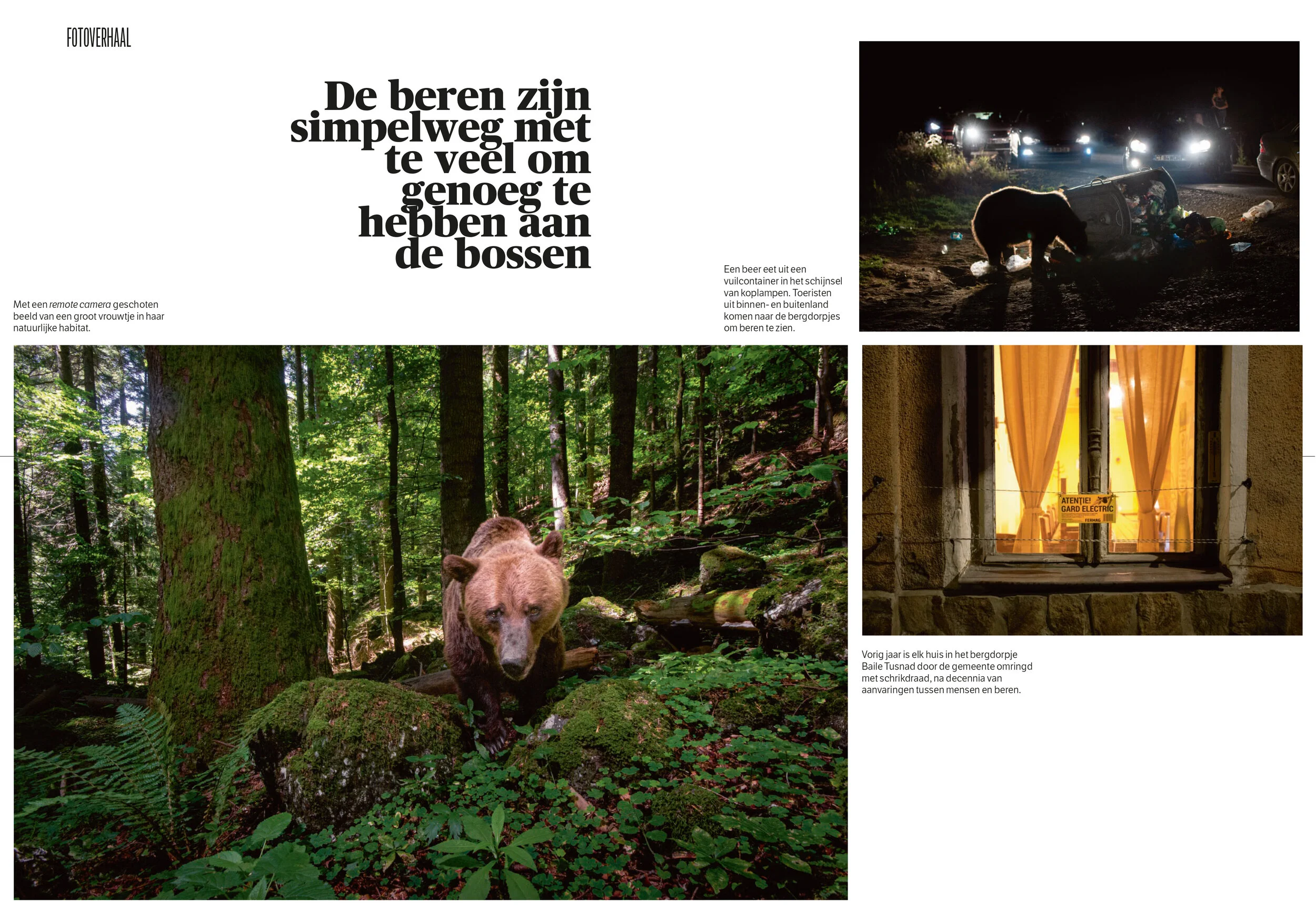 DE eerste keer dat ze een beer in het wild zagen, was op een camping aan de rand van het bos. David Hup en Michiel van Noppen, beiden natuurfotograaf, waren naar Roemenië gereisd om de dieren eens in het echt te zien. Zo’n zesduizend bruine beren zijn er naar schatting in het land – meer dan de helft van de totale berenpopulatie van Europa. Dat kon zijn, maar na twee weken hiken had geen ervan zich nog getoond aan de twee Nederlanders. De zon ging net onder die dag, vertelt Hup. Even koken. „Wij waren de enigen met een tentje, de rest zat in caravans. Ik stond bij het gaspitje. Plots zei Michiel: David, niet schrikken, niet omkijken. Leg je spullen neer en loop rustig naar mij toe.” Er stond een beer achter hem. „Mijn hart zat wel even in mijn keel.” Ze verschansten zich tussen de caravans en keken toe hoe de beer niet op hun maaltijd afliep, maar erlángs, en vervolgens de weg over, naar een vuilcontainer die daar stond. Vier keer is David Hup er sindsdien geweest om fot o’s te maken, waarvan twee keer samen met Van Noppen. De laatste keer was deze zomer. Ze legden de dieren vast die, zoals die ene op de camping, het bos uitliepen om in bewoond gebied voedsel te zoeken. Maar ze maakten ook gebruik van een remote camera: apparatuur die ze in de oerbossen achterlieten, om twee weken later weer op te halen en te kijken wat erop stond. „Op een van de foto’s stond een beer vlak voor de lens. Toen ik wat langer keek, herkende ik de vorm van het hoofd, de kleur van de vacht. Dit was een beer die ik ook al eens in de straten van het stadje gezien had.”